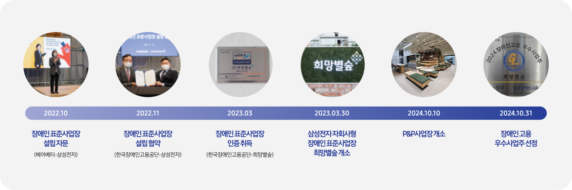 이에 삼성전자는 발달장애인들의 지속가능한 일자리 창출을 위해 자회사형 장애인 표준사업장 ‘희망별숲’ 을 설립했습니다. 희망별숲은 삼성전자가 100% 출자해 설립한 장애인 표준사업장이며, 제과 제조 사업을 시작으로 발달장애인들에게 안정적인 일자리를 제공할 예정입니다.