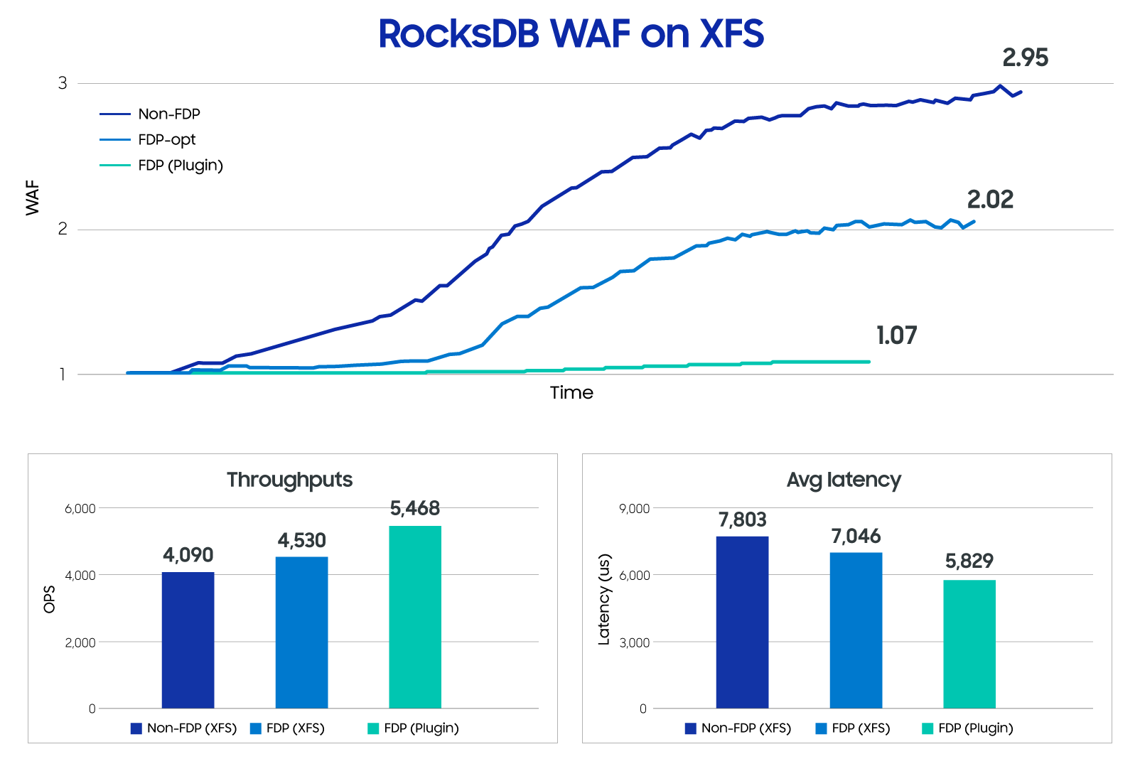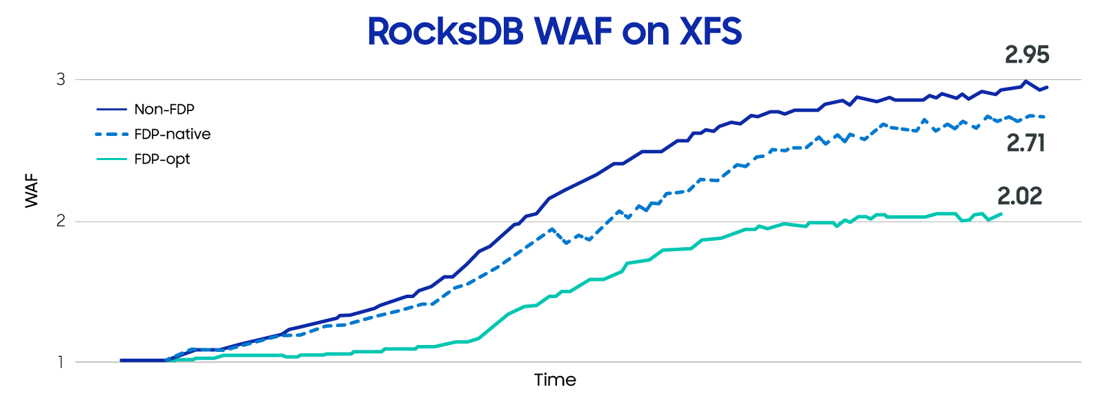 We conducted a comparative evaluation of our optimized RocksDB classification scheme on Samsung's FDP SSD (model U.2 PM9D3a, 7.68 TB) using the XFS file system. Both native and optimized schemes were tested on FDP SSDs as well as regular SSDs, with data loading and update operations on 200 million records using the Yahoo! cloud serving benchmark (YCSB). The results showed that the native scheme reduced WAF by ~8% on FDP SSDs compared to regular SSDs, while the optimized scheme achieved a 30% WAF reduction, a 10% increase in operations per second (OPS), and a 55% improvement in p99.9 tail latency.