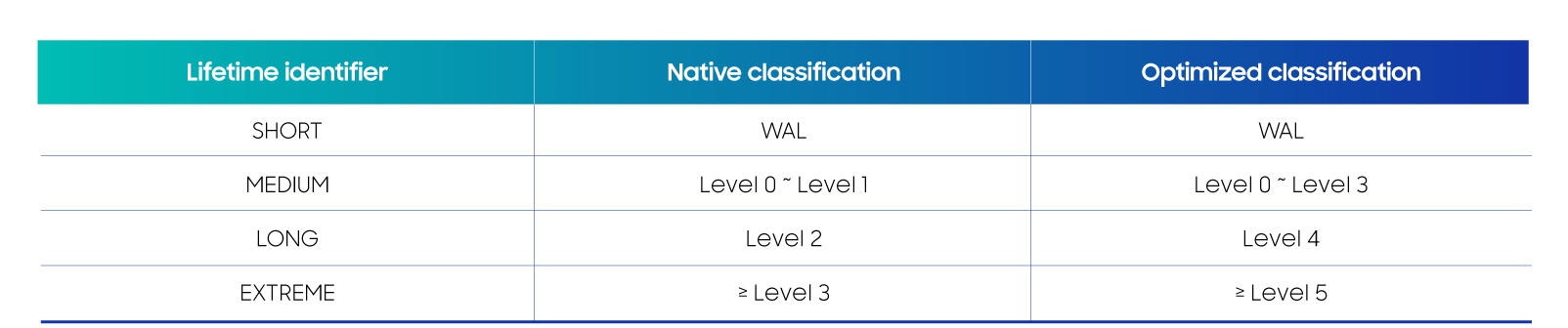 Building on these findings, we propose an optimized lifetime classification strategy that replaces the default configuration. In this scheme, WAL file markings remain unchanged. Level 0 to 3 files are uniformly marked as MEDIUM, level 4 files as LONG, level 5 and above files as EXTREME, and all other unclassified files are marked as NOT_SET. This revised mapping better reflects the actual lifetimes of RocksDB data, as summarized in Table 1.